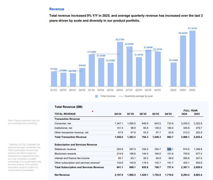 这一数字较2024年的9.11亿 美元实现增长,仅2025年第四季度稳定币收入就达3.64亿 美元。由于USDC余额带来的利息收入成为相较于波动较大交易手续费的高利润来源,稳定币业务表现突出。