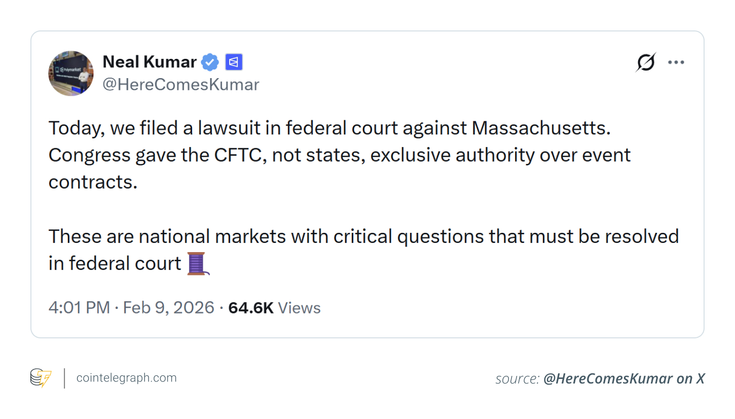 2026年2月,Polymarket 向美国马萨诸塞地区联邦地区法院提起诉讼,旨在阻止州级监管机构强制其遵守马萨诸塞州博彩法律。该公司主张,国会已赋予 CFTC 对“事件合约”(预测市场核心产品)的专属监管权。据 Polymarket 称,州政府试图阻止或限制其运营的行为属于非法干涉。