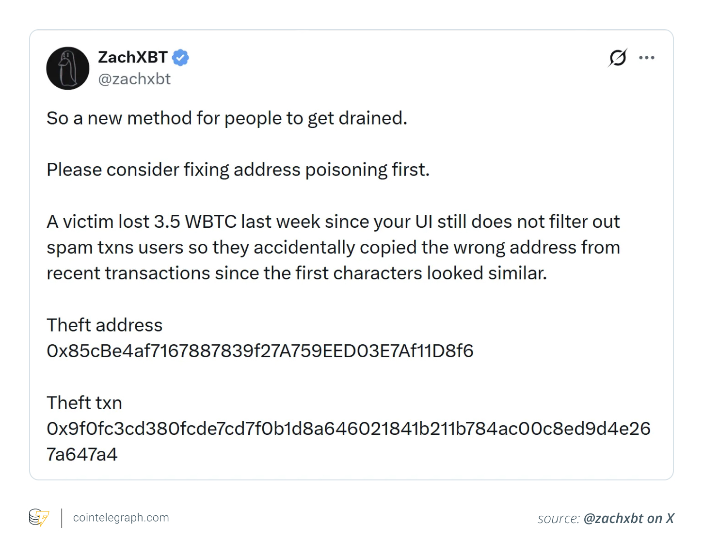 2026年2月,一起网络钓鱼事件针对Phantom Chat功能发起。攻击者利用地址投毒手法,成功窃取了约3.5枚Wrapped Bitcoin (wBTC),价值超264000美元。