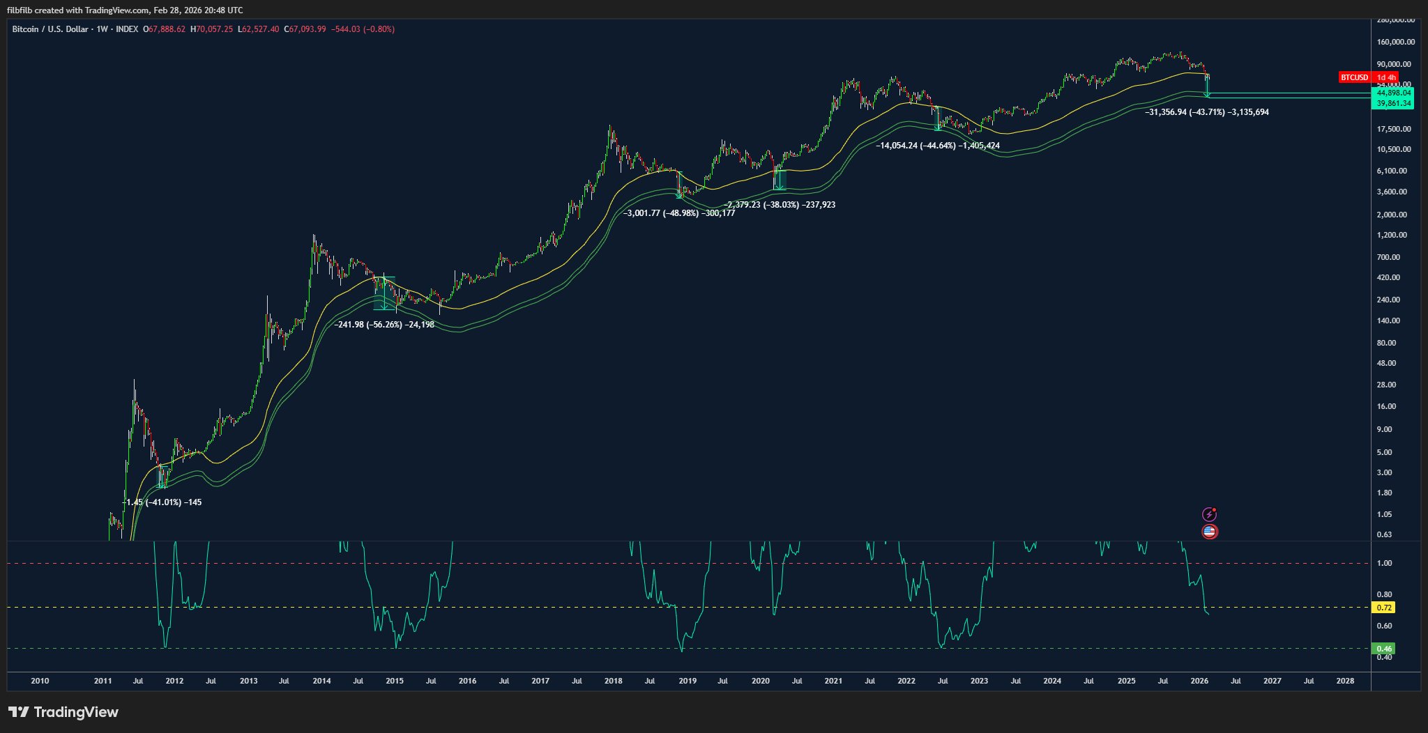 “自创立以来,每一次周收盘低于黄色区间,都会带来大约40%至50%的回调。”Filbfilb向X粉丝展示了一份历史价格走势图。