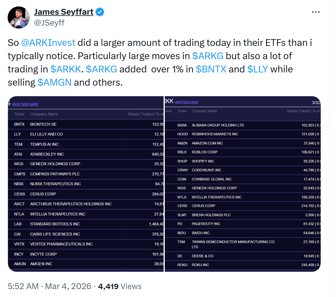 ETF分析师James Seyffart在X平台发文(ARK当天“交易量明显高于以往”。)